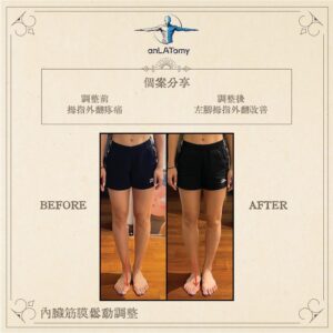 Jessica主訴拇指外翻的疼痛難耐,下腰肌肉緊張,在溝通下,發現日常也會由於工作及訓練鋪排緊密,比較難按時用餐,腸胃偶有不適及胃痛。初步觸診下,腹腔靠近十二指腸位置張力異常緊張,透過輕柔的筋膜鬆動,並搭配呼吸訓練過後